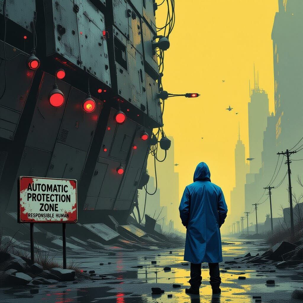 This image shows a lone figure in a desolate post-apocalyptic landscape. A massive, ruined metal wall with red lights looms over a weathered sign. The scene has a bleak yellow hue and a strong dystopian atmosphere.