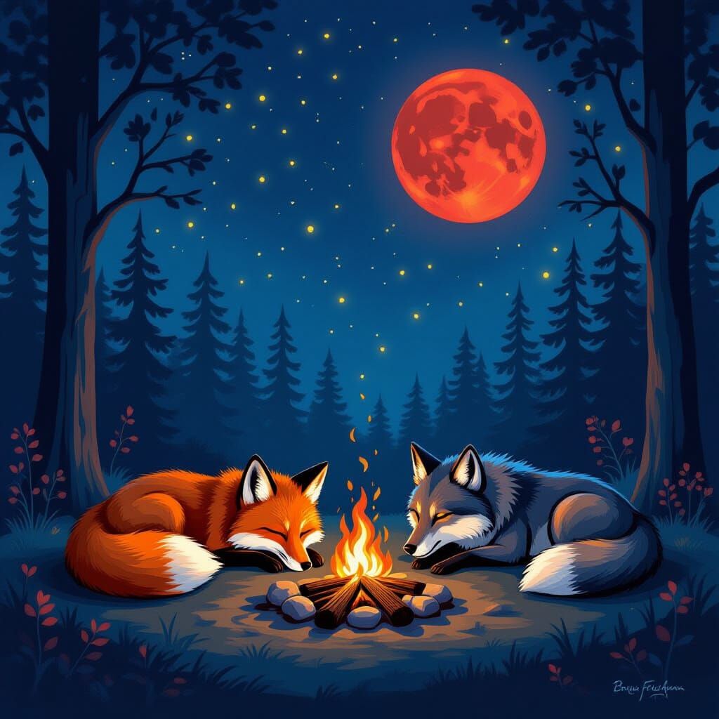 This image shows a fox and wolf sleeping by a campfire under a red moon. Ethereal fairy lights add a magical glow to the serene forest scene, rendered in a whimsical, illustrative style.