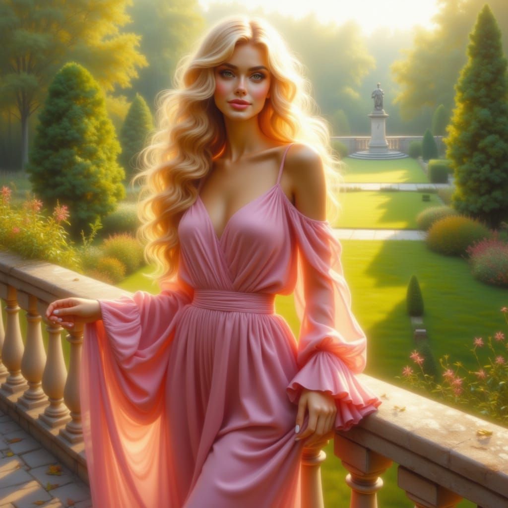 This image shows a blonde woman in pink robes on a balcony overlooking a green park. Volumetric lighting creates a warm, golden atmosphere, reminiscent of romantic classicism.