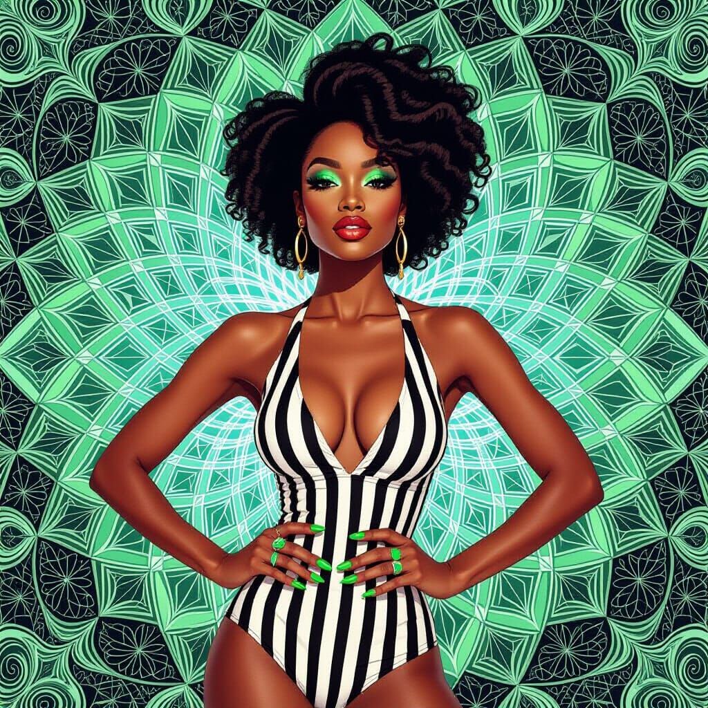 This image shows a Black woman with white striped clothing and green nail polish striking a pose. The background features an abstract blend of vector fractals, Zentangle details, and 3D shading, in a digital art style.