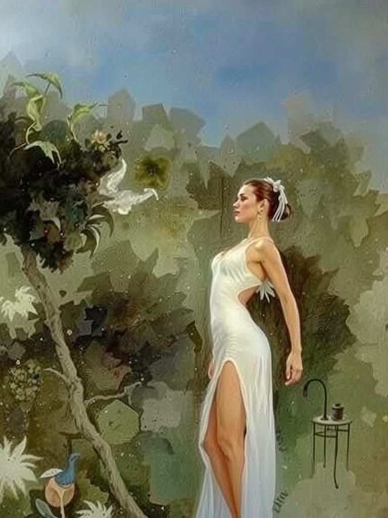 This detailed painting features a woman in a flowing white split dress in a maximalist fantasy style, rendered with watercolor techniques.