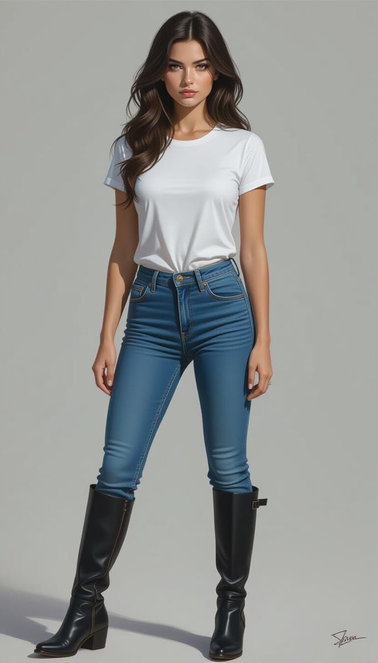 A striking picture of a dark-haired girl in casual attire staring intensely at the viewer. The image is rendered with stylized realism and dramatic lighting, creating a confident and atmospheric mood.