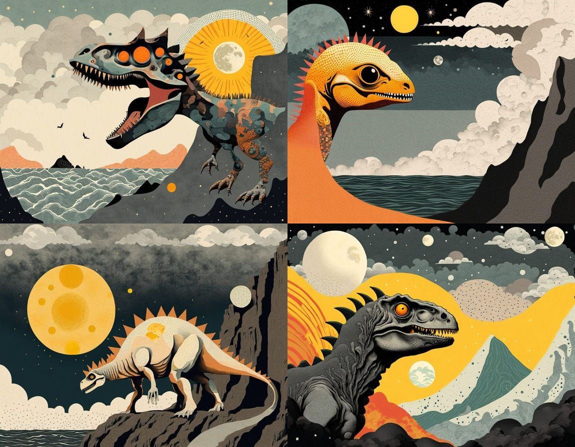 This image shows a dinosaur-like creature under a stormy night sky, with wave-like formations rising to a cliff top. The artwork features halftone patterns and textures in a mixed media collage style.