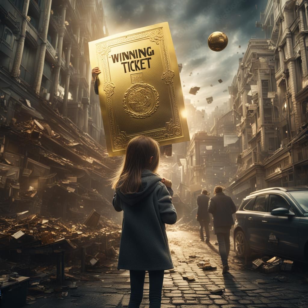 A digital painting of a girl holding a golden ticket in a city. The image is highly detailed, cinematic, and atmospheric.