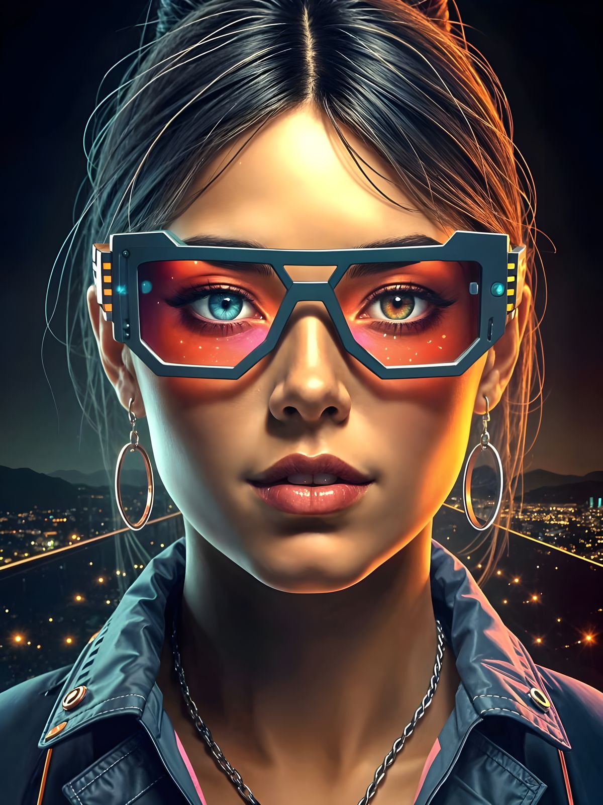 This image shows a beautiful woman wearing AI glasses with interchangeable eye colors, set against a breathtaking cityscape at sunset with warm, glowing lights.