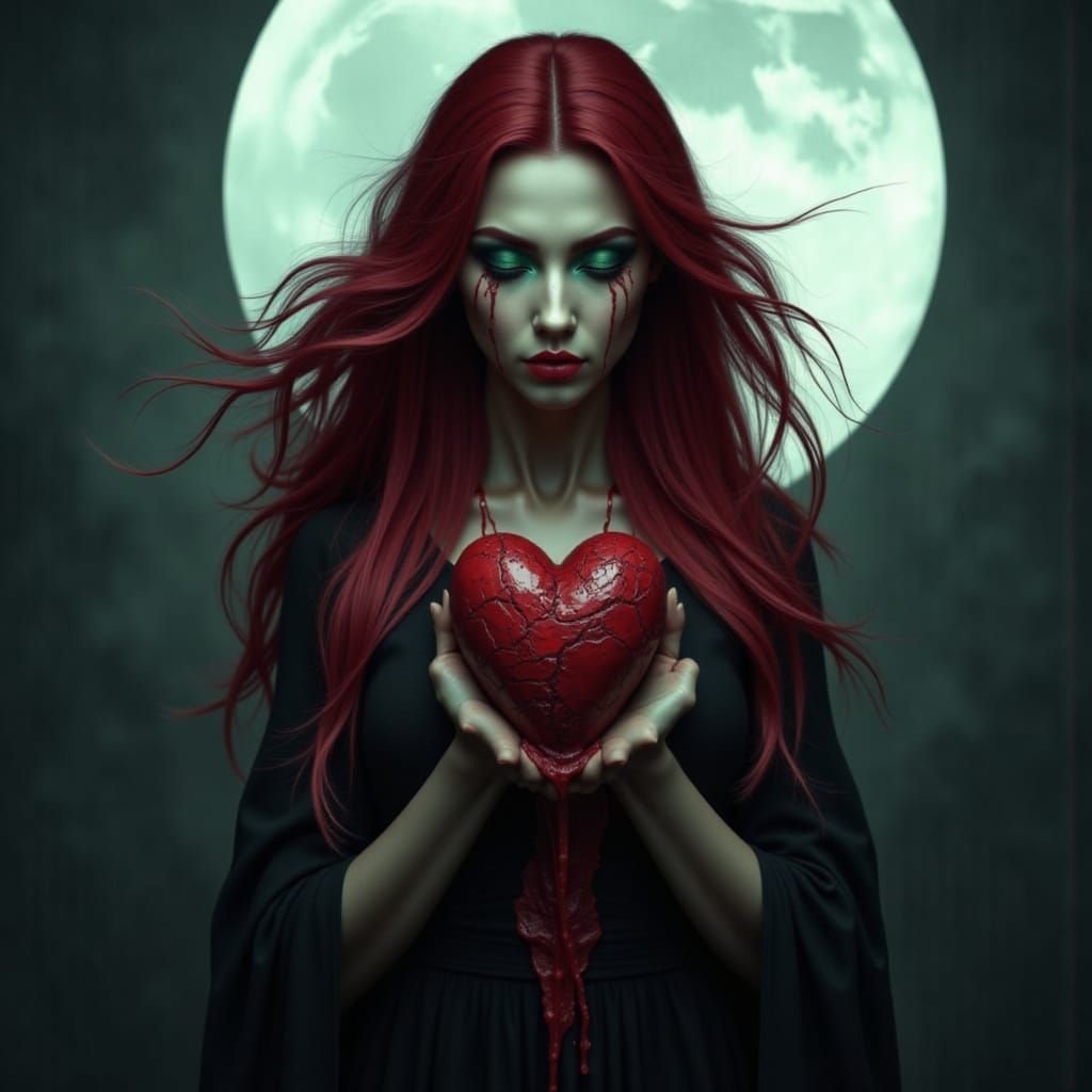 This hyper-realistic image shows a voluptuous vampire with long red hair and glowing green eyes, biting into a human heart. The horror-core aesthetic emphasizes insane detail and quality.
