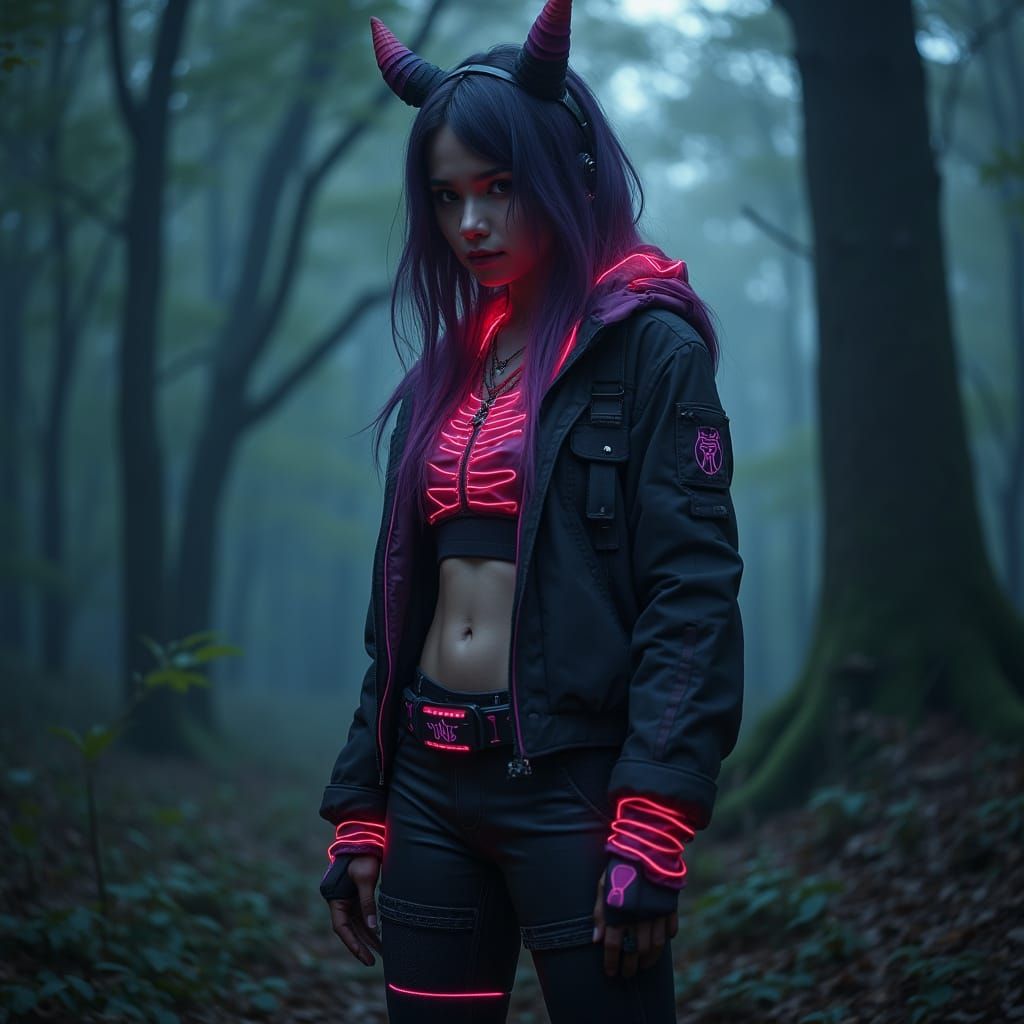 This image shows a woman in a neon-accented gamer outfit in a dark, mystical forest. The artwork blends cyberpunk and fantasy elements in a digital painting style.