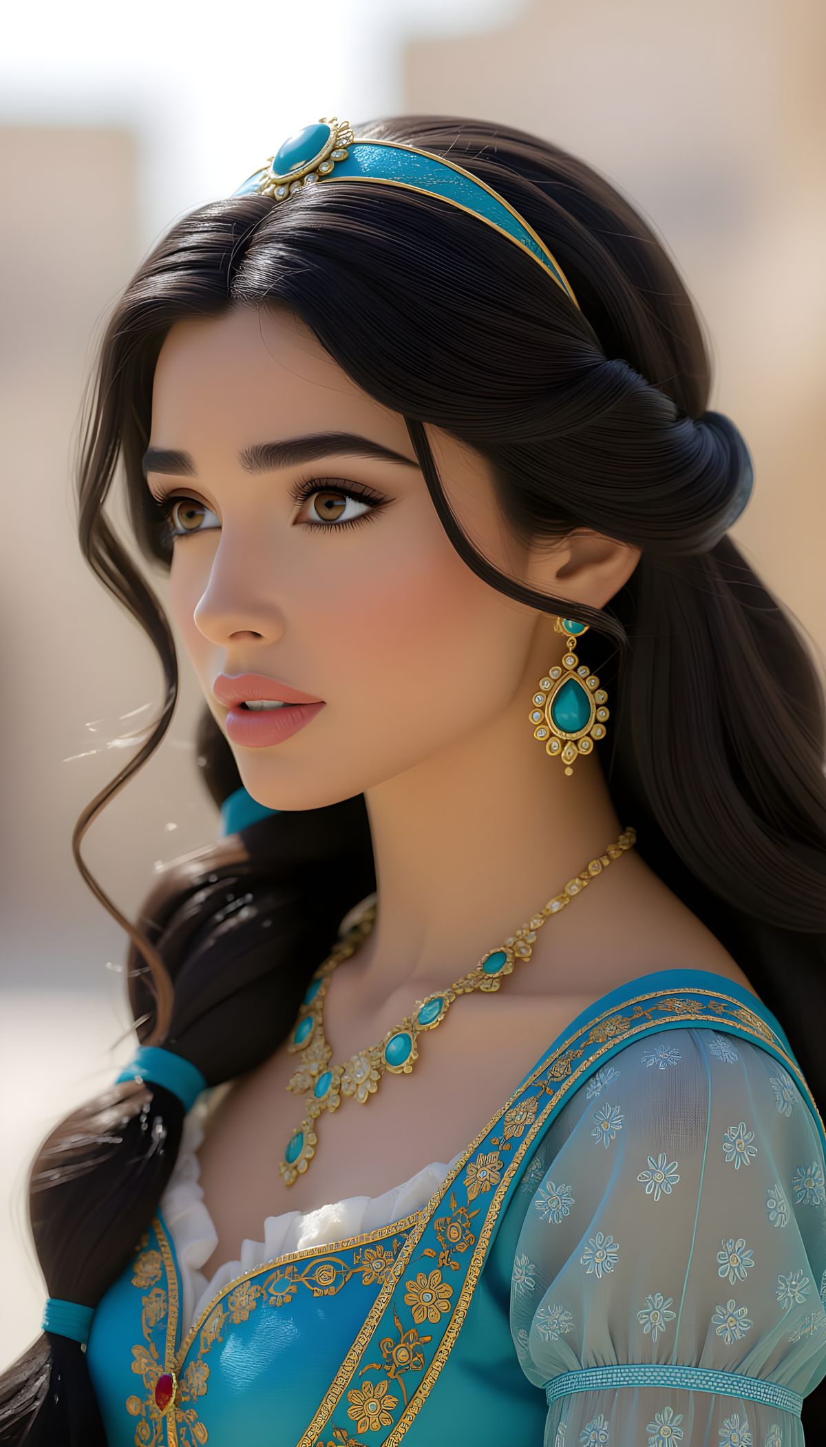 This image is a hyper-detailed, ultra-sharp close-up portrait of Jasmine, rendered in a realistic Pixar animation style. It captures cinematic lighting and film grain for a dramatic effect.