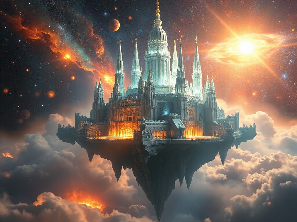 This image showcases a majestic, floating island city in space, adorned with grand crystal towers that emit ethereal light. Rendered in an ethereal digital matte painting style with vibrant cosmic colors.