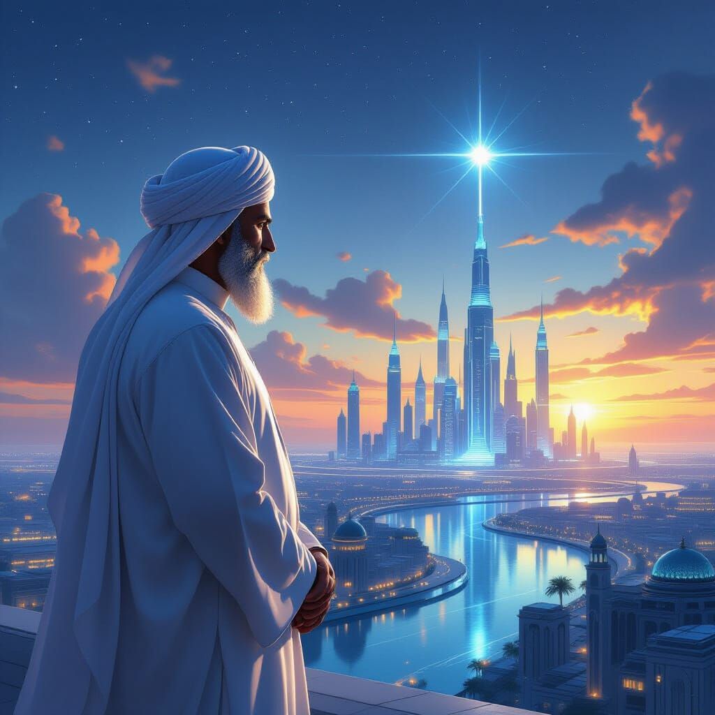 This image shows a wise Imam radiating peace before a vast futuristic city. The surreal, photorealistic art style creates a dreamlike scene of contemplation and faith.