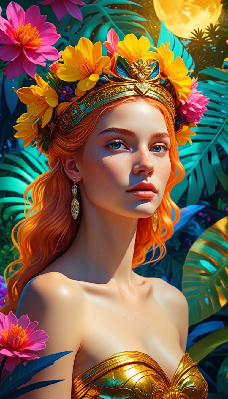 A vibrant image of Venus in a lush, tropical garden. The artwork features bold colors and loose brushwork, rendered with exaggerated hues in a fauvist style. A holographic astral cosmic aesthetic enhances the scene.