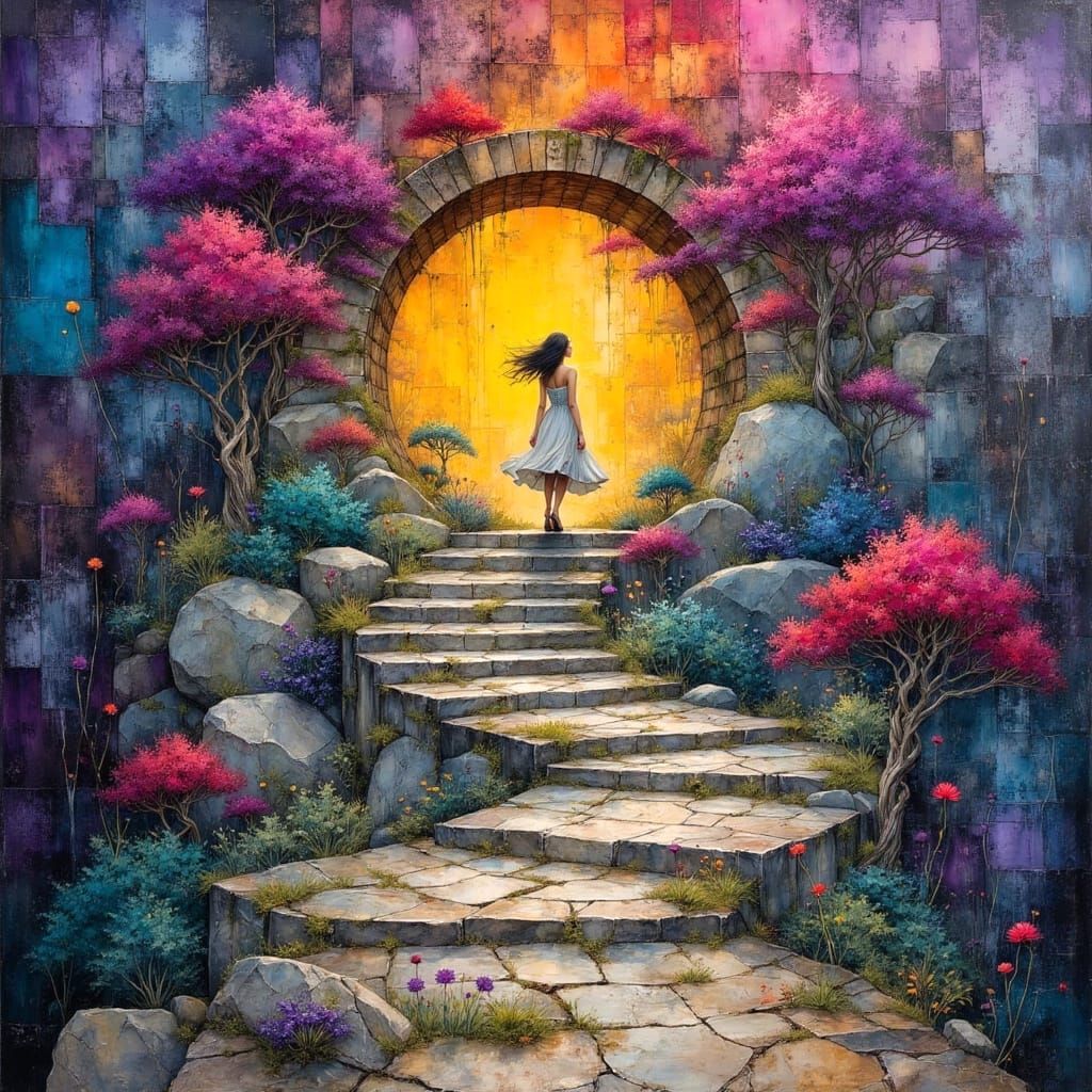 This image shows a surreal oil painting of a winding stone path leading to a portal. A woman stands in the portal, surrounded by bonsai trees and vibrant colors, in a volumetric style.