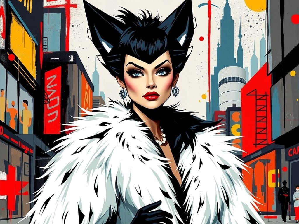 This image is a vibrant, expressionist oil painting of Cruella de Vil, set against a dynamic, abstract urban backdrop with bold, geometric shapes and splashes of color. Her iconic black and white hair and luxurious fur coat are depicted in bold, impasto brushstrokes, evoking a sense of elegance and chaos...