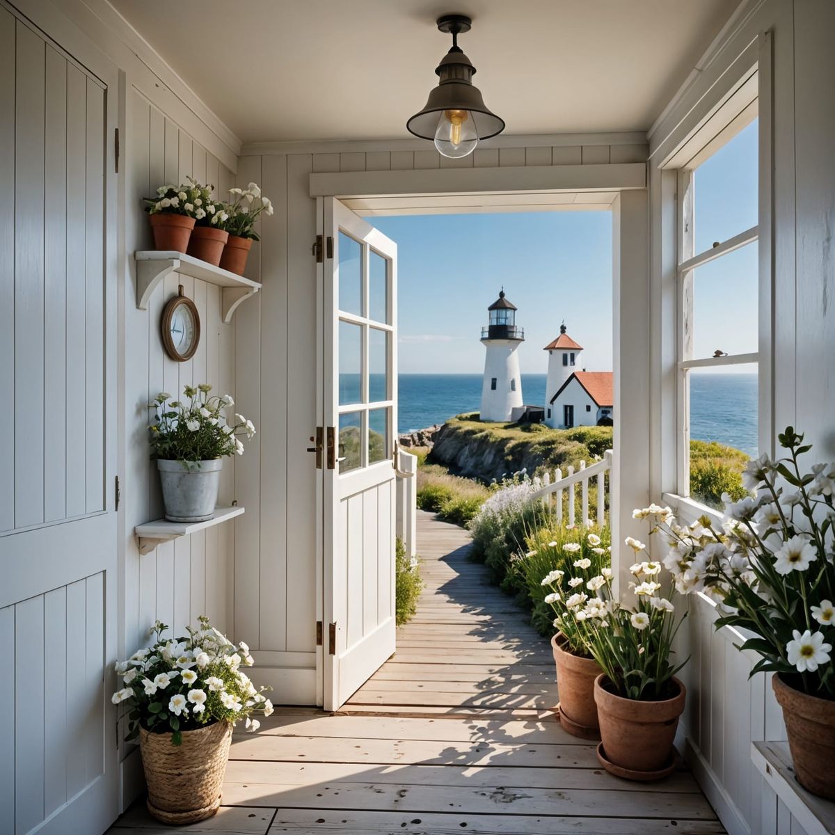 A beautiful view of the sea framed by a doorway in a rustic, coastal-themed lighthouse. The interior features a mezzanine bed, wooden details, and potted flowers.