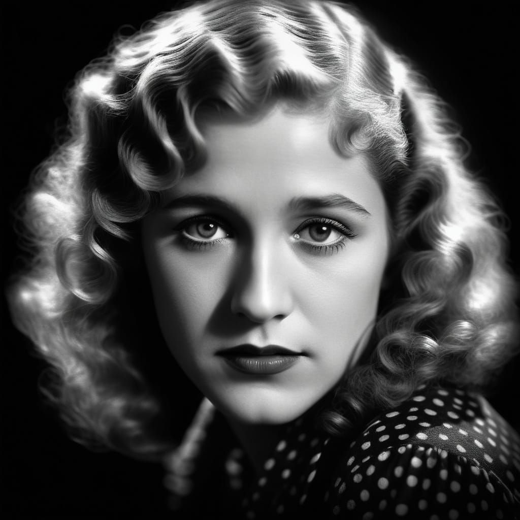 A striking black and white portrait of silent film star Mary Pickford. The image evokes classic Hollywood with soft focus, dark shadows, and a vintage, cinematic aesthetic.