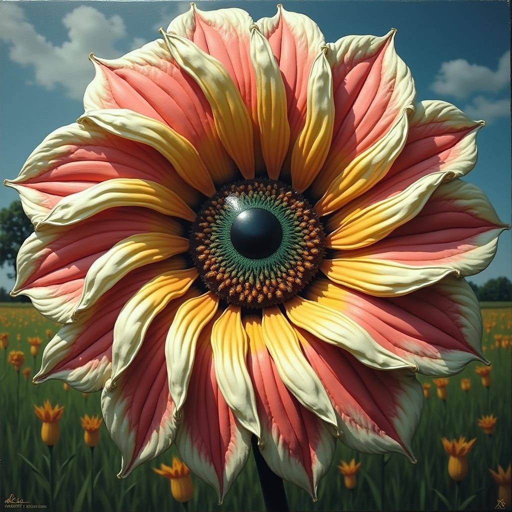This AI-generated image depicts a surreal scene with figures reminiscent of a Matador and Harlequin, set against a vibrant sky and fields. It is rendered in a hyper-realistic, cloisonné style with striking color contrasts.