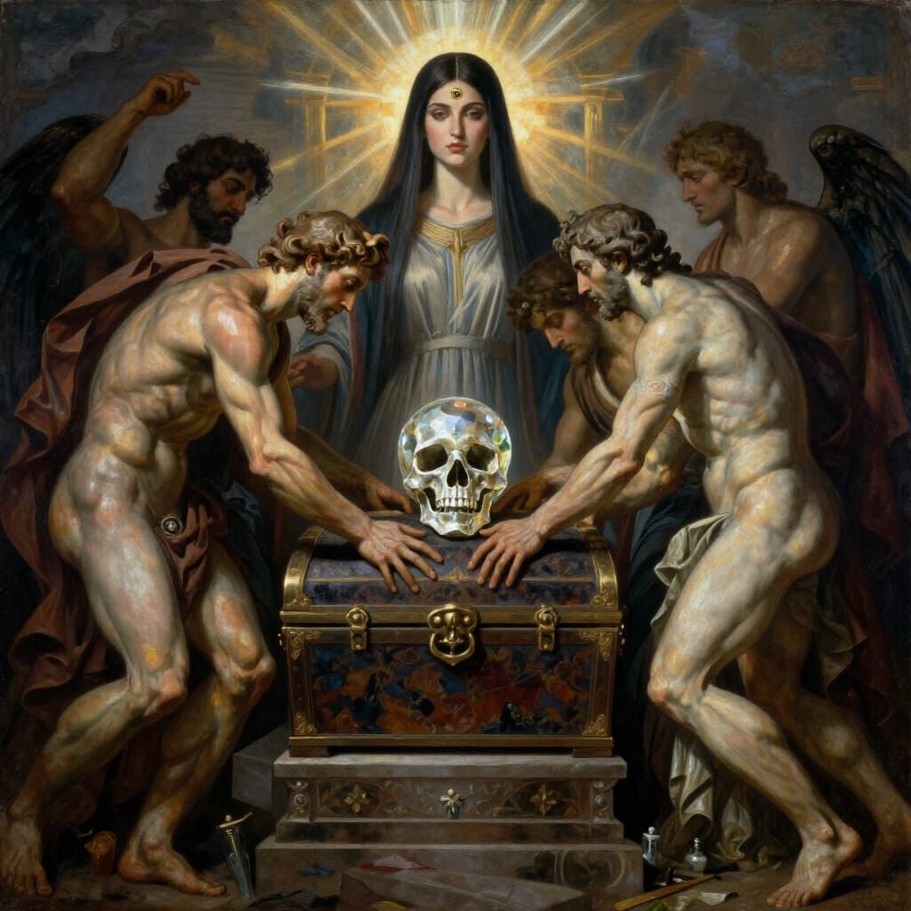 tragedy, epic antique scene, michelangelo paintings style and colours : statues guys holding chest treasure like coffin, beautiful armenian woman with ultra straight hair in background, third eye chakra,, ray of lights between characters, ultra deep contrast, large scene composition, crystal skull