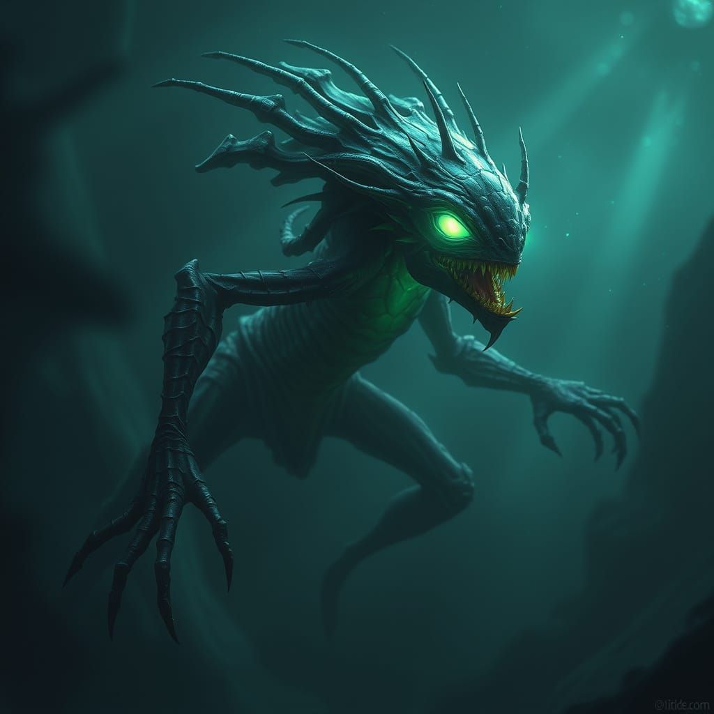 This image depicts an otherworldly, bioluminescent alien creature in an underwater environment. The digital artwork showcases a unique alien lifeform in a vibrant, deep-sea setting.