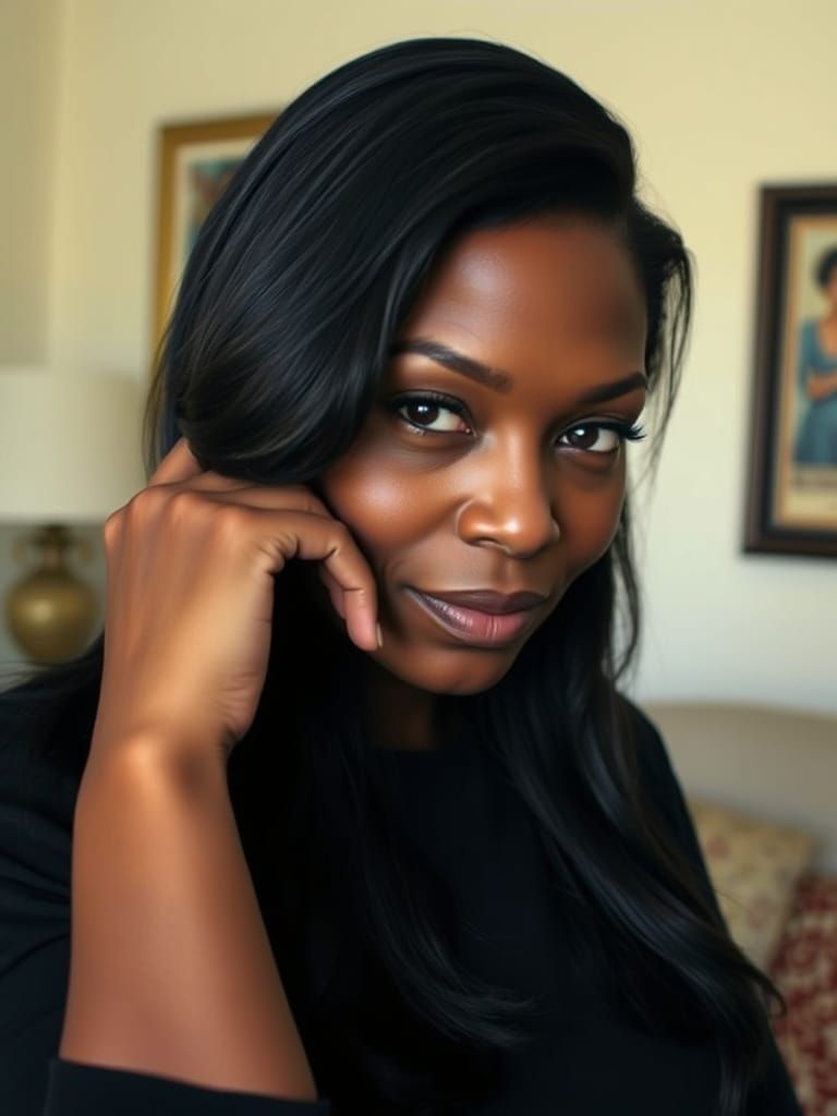 A captivating image of a black woman gazing directly at the camera. Soft lighting and a blurred background emphasize her subtle expression in this warmly intimate and nuanced portrait.