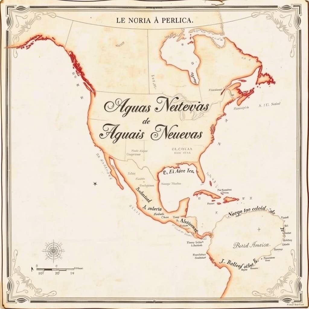 A vintage map of North America, hand-drawn and labeled in Spanish script. The map presents the continent under the fictional governance of "La República Popular de Aguas Nuevas", in a watercolor style.