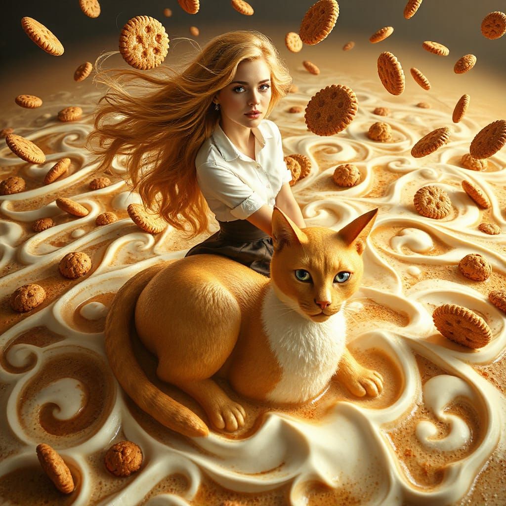 A striking image of an elegant woman on a giant coffee cat, surrounded by a sea of cappuccino and floating cookies, rendered in a dreamlike, whimsical style with soft lighting and intricate textures.