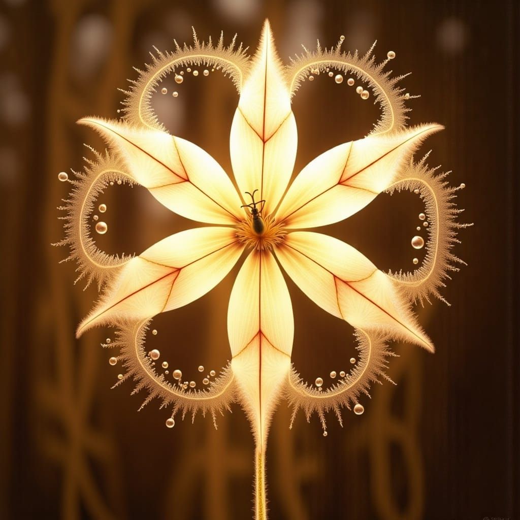 This image features a surreal landscape of a sunlit meadow, adorned with glowing dew drops and intricate patterns, creating a breathtaking optical illusion.