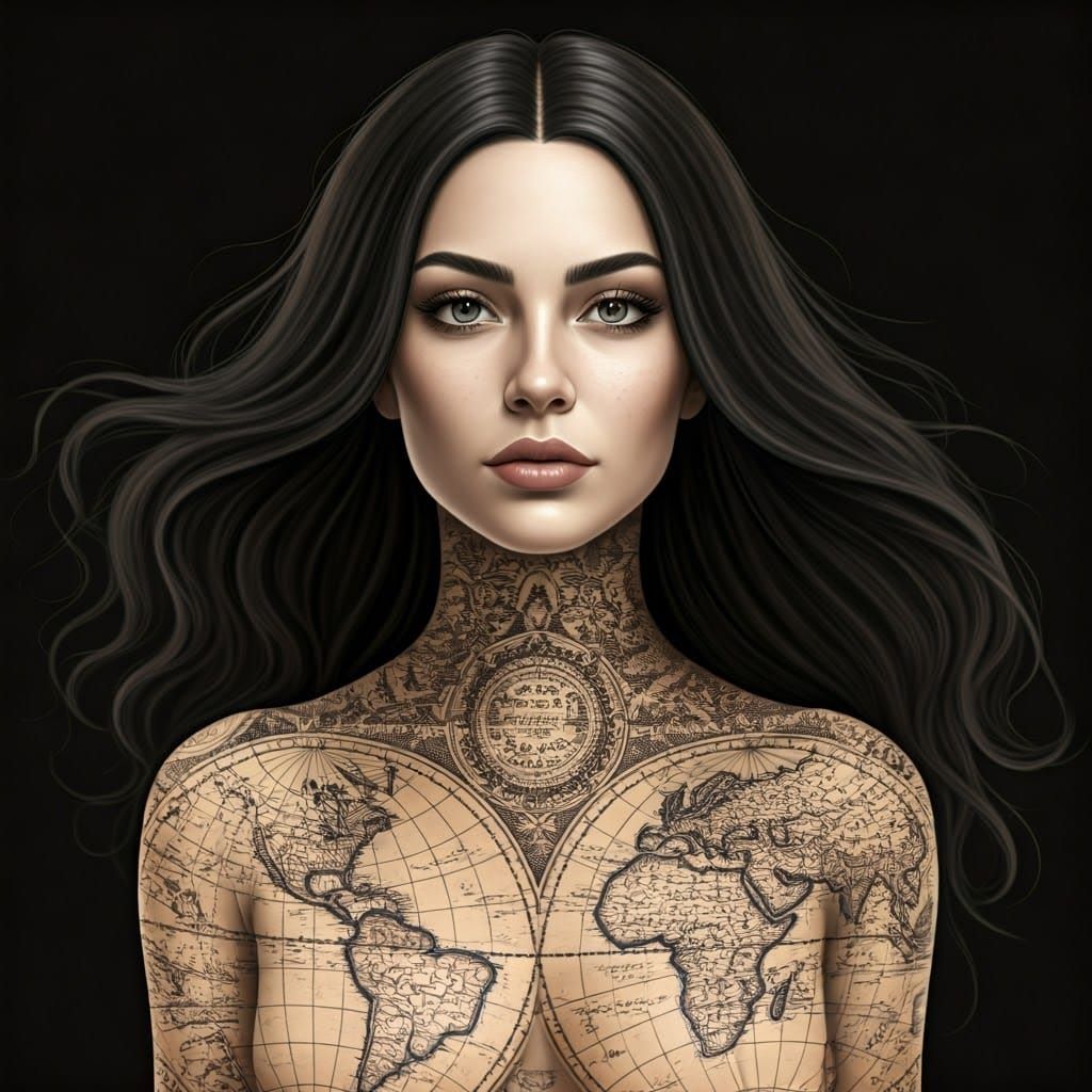 This image shows a young woman with long black hair, her frontal body covered in detailed, sepia-toned tattoos of an ancient map. The artwork features dramatic lighting and delicate linework.