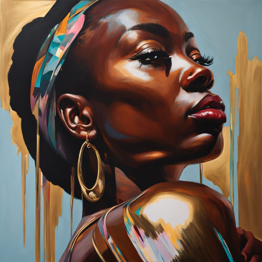 A striking portrait of a figure in a low-angle, Dadcore-inspired scene, with metallic accents and expressive brushstrokes, reminiscent of vitrail art.