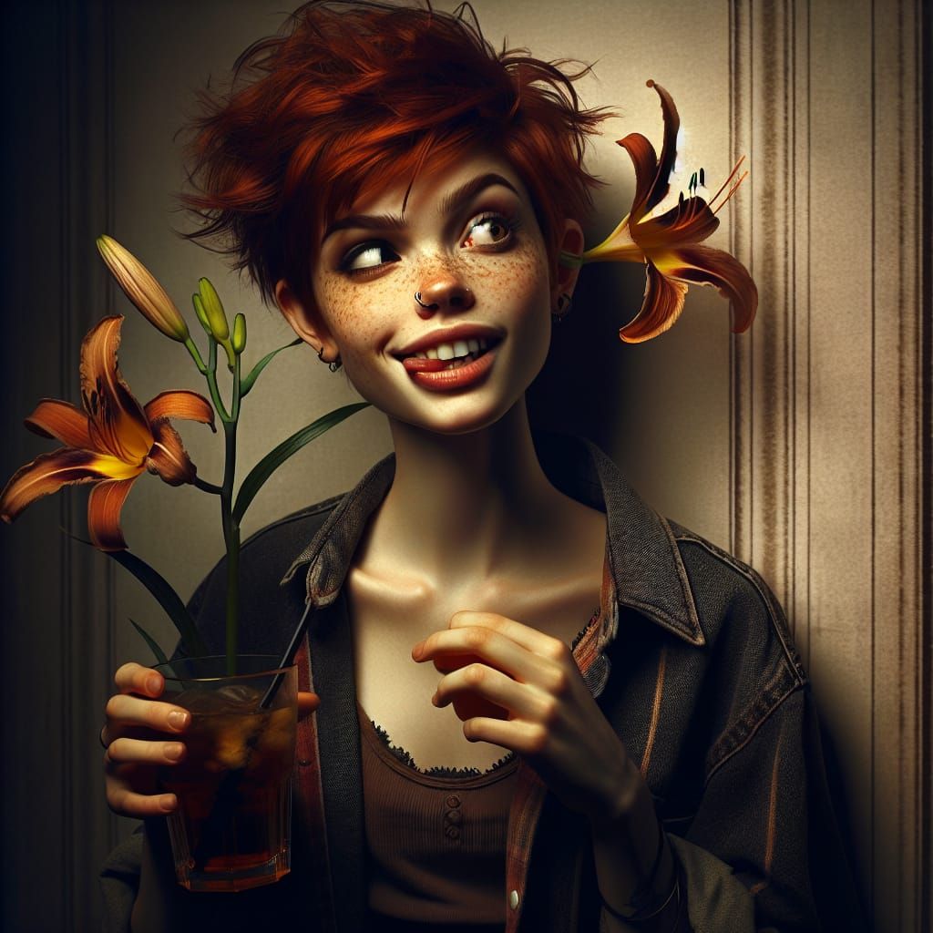 film noir full body tiger lily young 30ish ginger hair freckled cross-eyed sly grin homely but cute woman grunge couture tshirt messy pixie hair shy standing tongue tied in the corner with a drink in her hand (tiger lily flower behind her ear) looking off to the side dreaming (no nose piercings) in ...