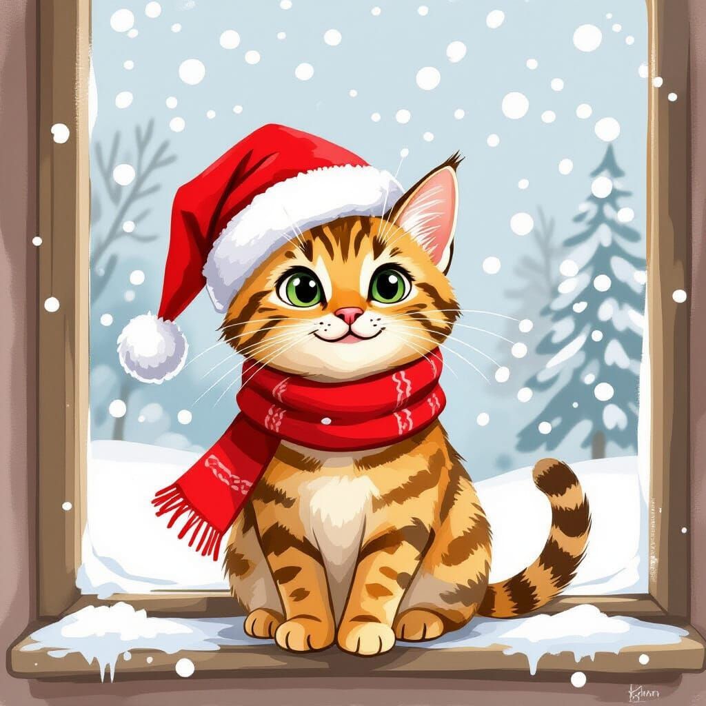 This charming AI-generated image depicts a joyful Bengal cat wearing a Santa hat and scarf, sitting by a window and watching snowflakes fall. It features soft watercolor textures and gentle brushstrokes.