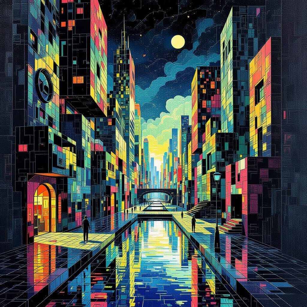 M.C. Escher.. Futuristic paradoxical art woodcut and woodblock style a city. ivid colours mixed and reflections of water in street..