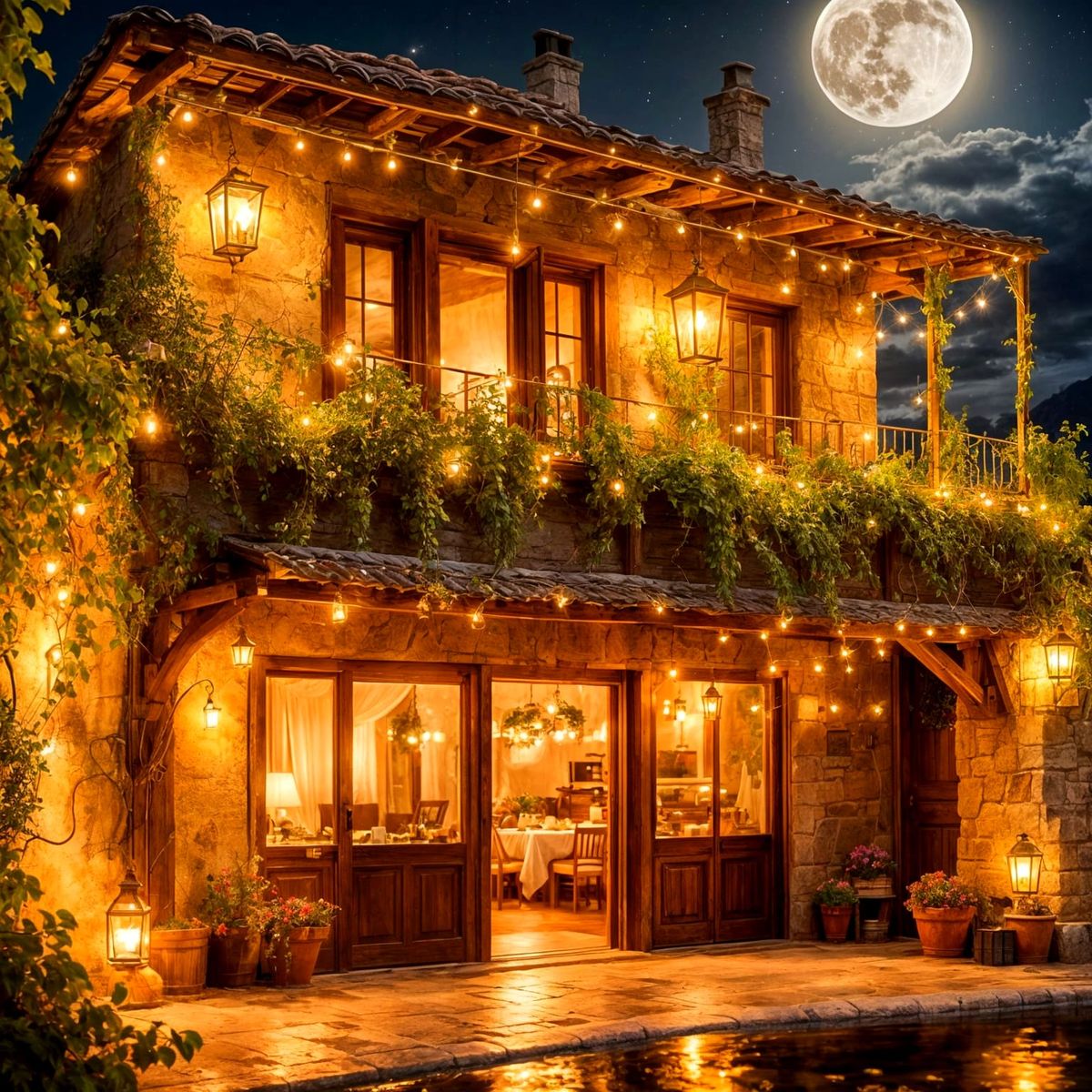 Beautiful rustic little restaurant with romantic lighting under a full moon