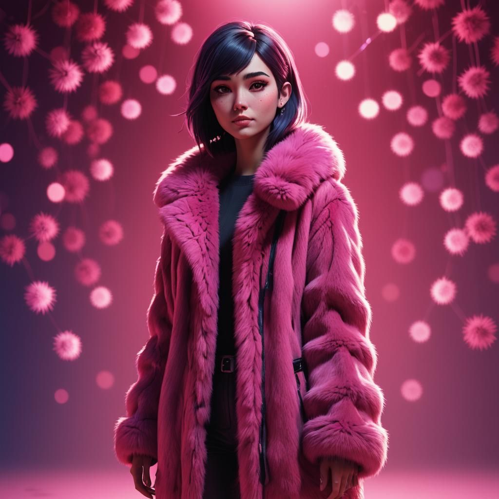 This image shows an emo girl in a fur coat standing against a bright background. The digital art style features 3D shading and radial gradient colors shifting to deep pink, reminiscent of ZBrush textures.