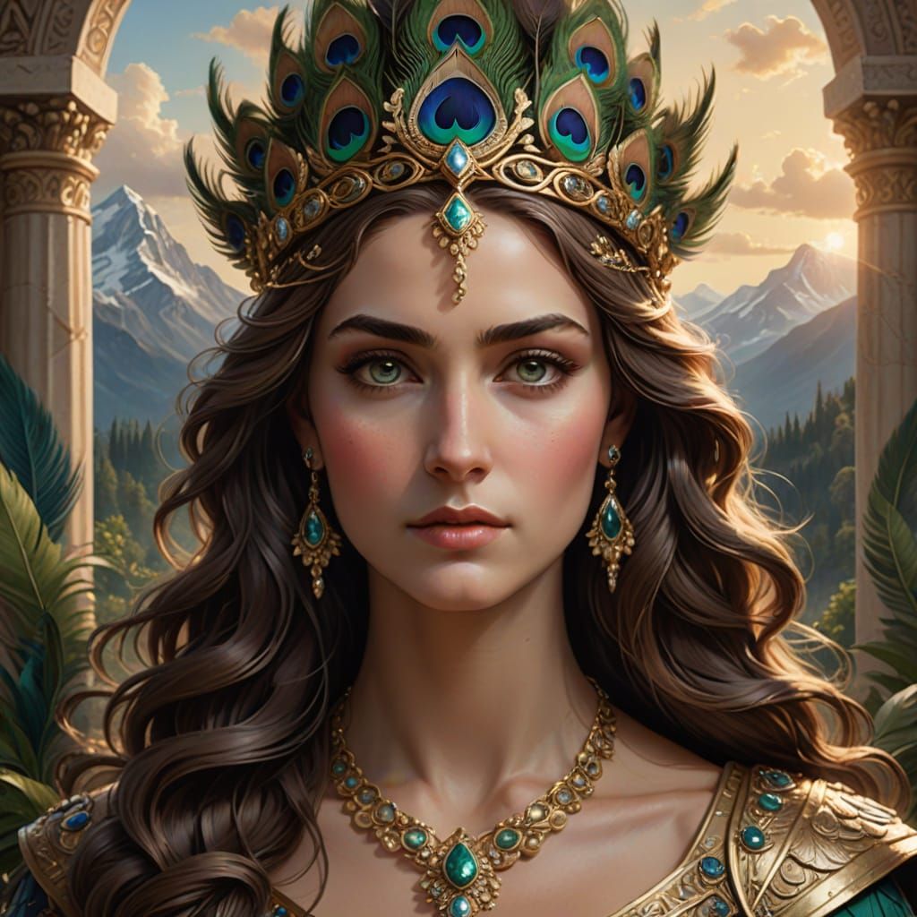 This image shows a close portrait of Hera, the Goddess of Family, with long, wavy walnut hair and hazel eyes. She wears a peacock-colored gown with diadem-like jewelry. The background evokes Mount Olympus.