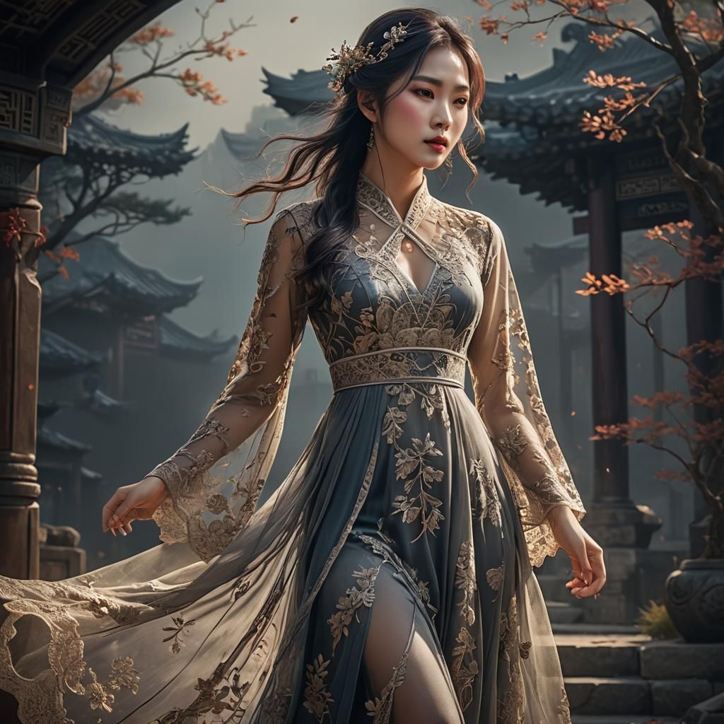 This image shows a beautiful Korean woman in a flowing lace dress, standing against a dimly lit background. The matte painting style and deep colors create a fantastical, detailed scene.