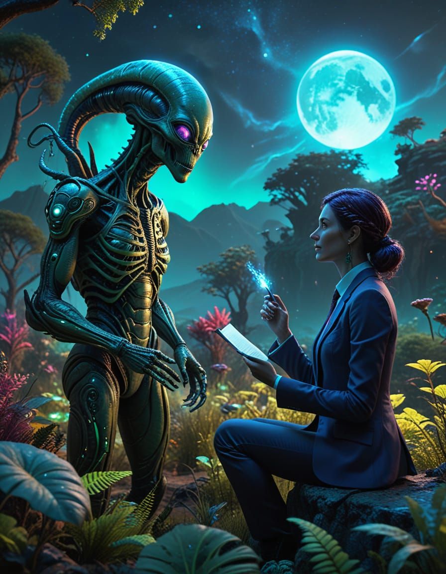 This image shows an alien journalist interviewing an Earth politician amidst glowing plants on an alien planet. The artwork features soft, ethereal lighting and a vibrant color palette, rendered as digital painting.