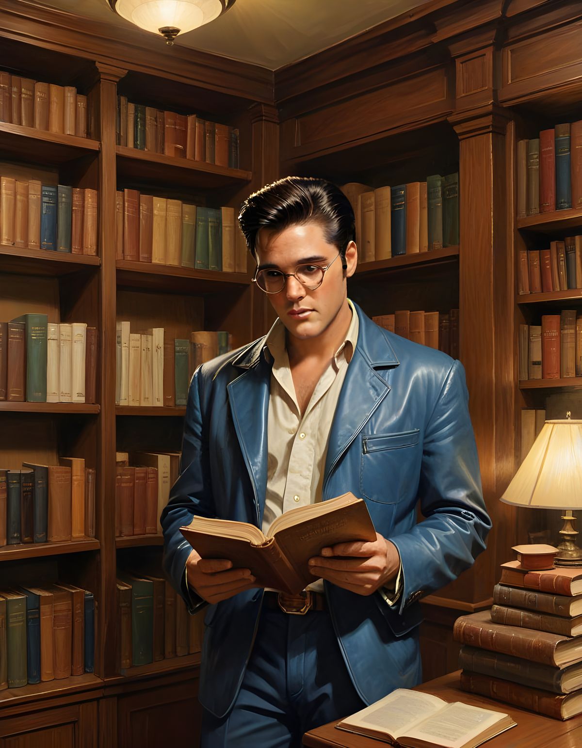 This oil painting captures Elvis Presley in a grand, wood-panelled library, surrounded by ancient tomes and warm, golden lighting. Influenced by nostalgic storytelling and quiet introspection, the portrait exudes a sense of refined elegance.