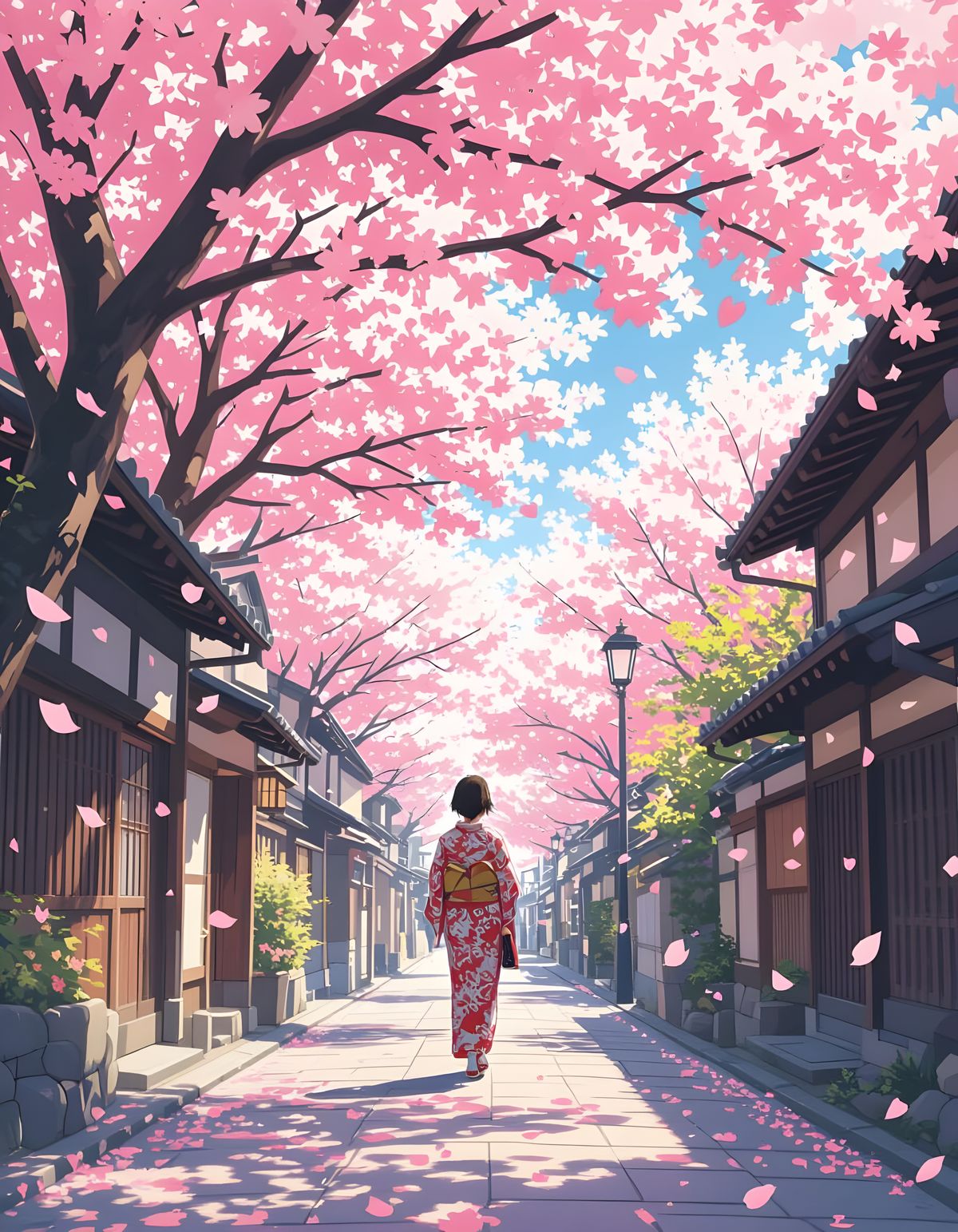 This detailed digital illustration captures a serene Japanese spring scene with a woman in a kimono walking away as hundreds of cherry blossom petals swirl in the wind.
