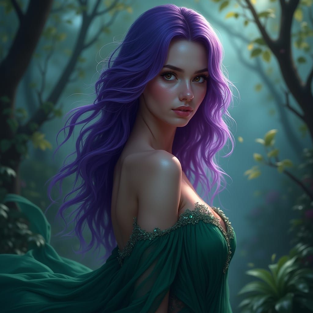 This image depicts a serene woman with vibrant purple hair and brown eyes, wearing an emerald gown. Illuminated by twilight and bioluminescence, in a fantasy digital art style with dramatic lighting.