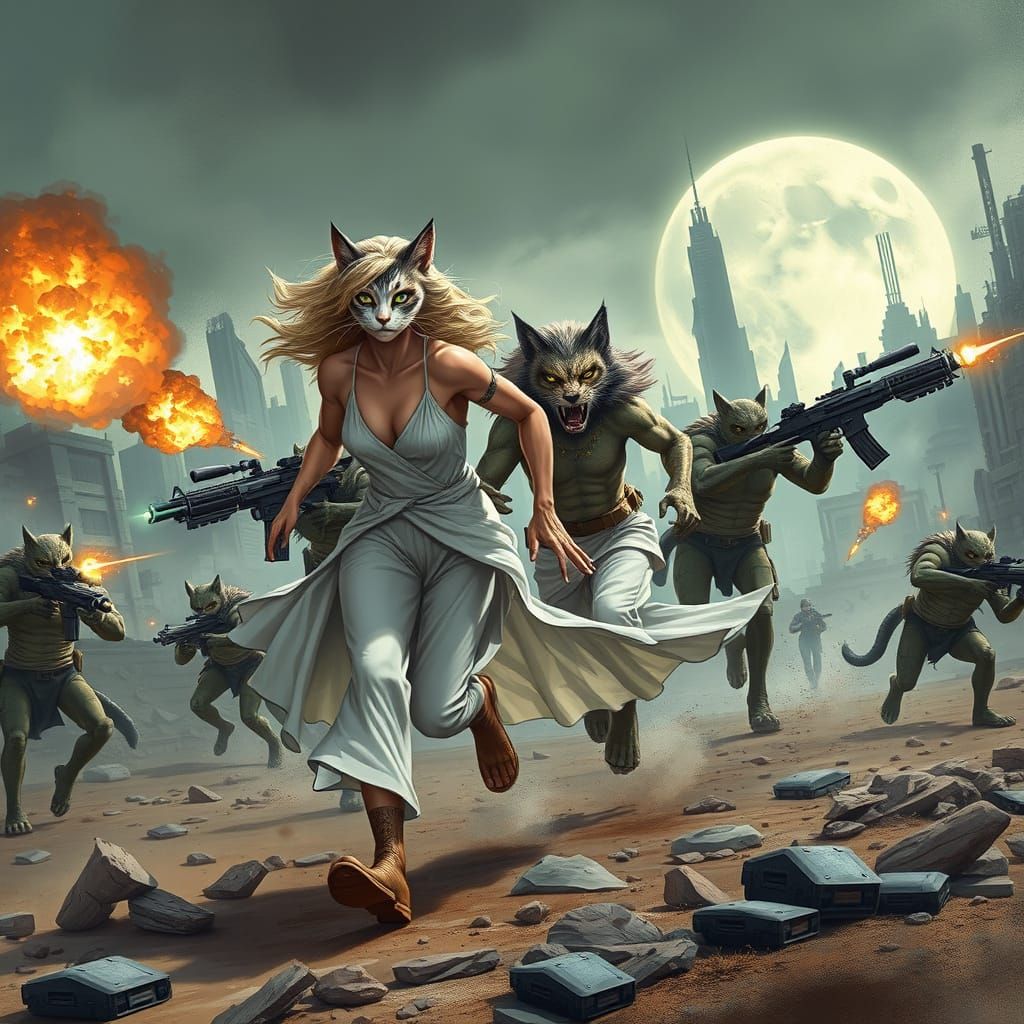 This image depicts a feline woman and her cat-man lover escaping a war-torn city under attack by wolf-like humanoids armed with futuristic weapons, set in a dark, industrial sci-fi world with a dynamic, high-tech aesthetic.