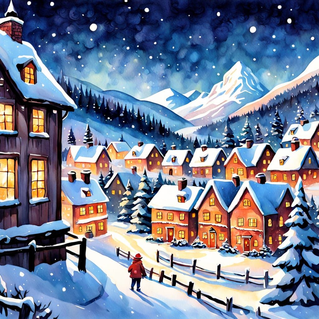 This image showcases a stylized collage of a cozy Christmas village scene. A warm glow from a window highlights the snow-covered houses. Rendered as a watercolor sketch with delicate washes and evocative brushstrokes, it captures a charming, festive holiday spirit.