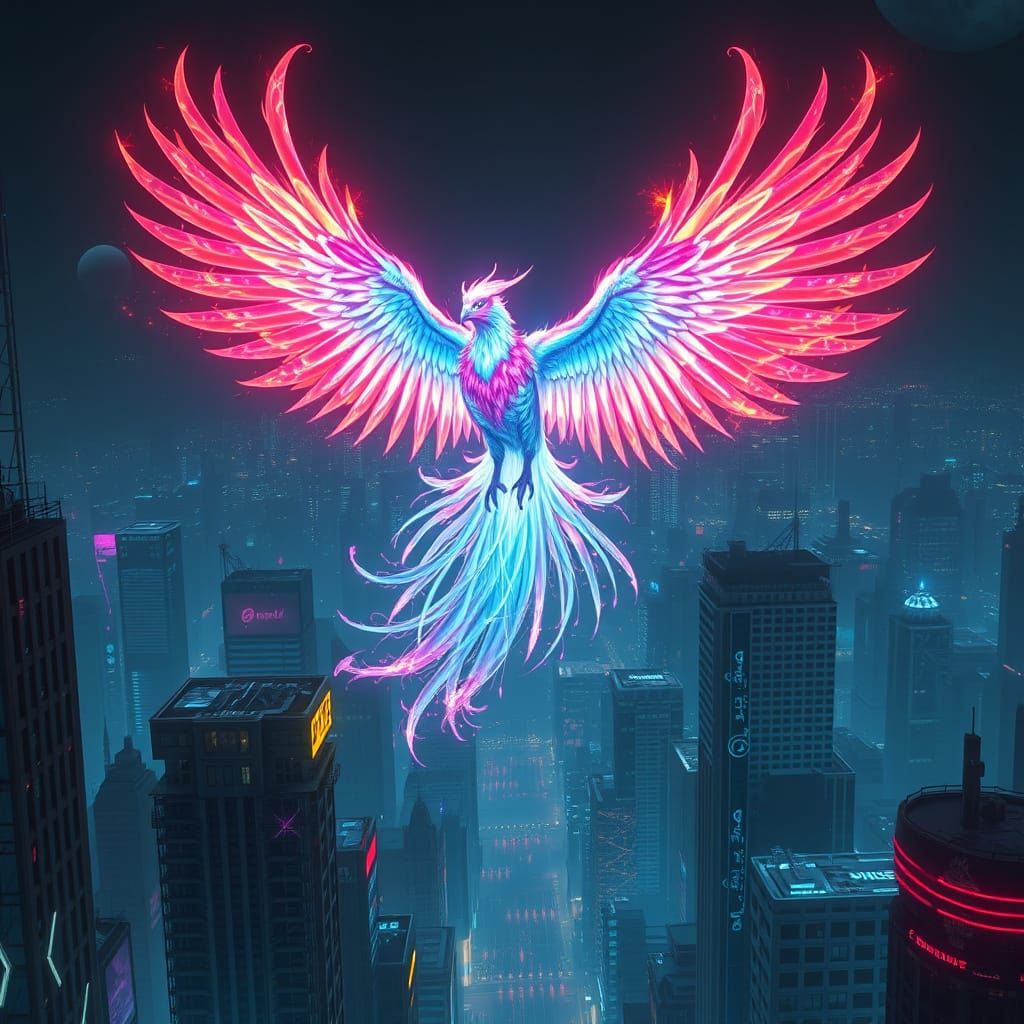 A vibrant, AI-generated image shows a bioluminescent phoenix flying over a cyberpunk city. The phoenix glows with iridescent colors, casting shadows on the futuristic metropolis in a neon noir aesthetic.