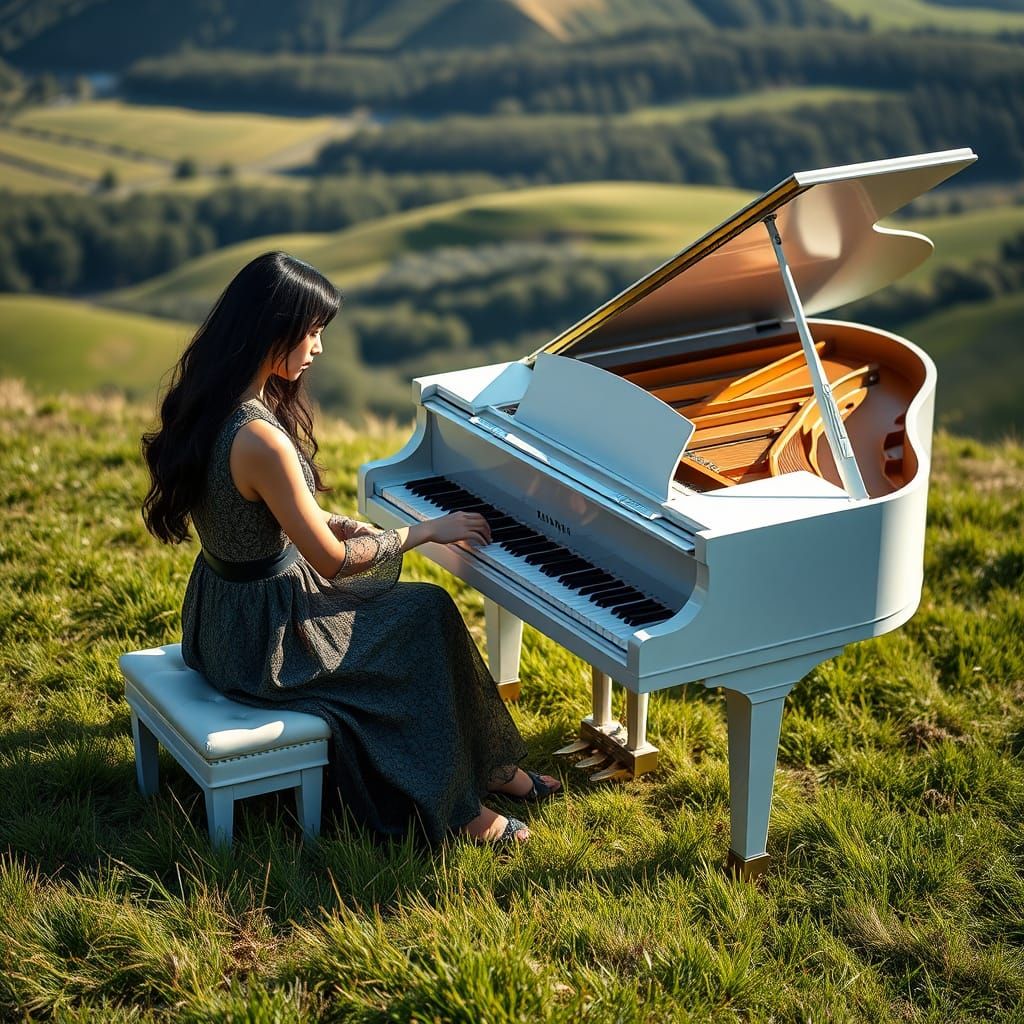 This image shows a young woman playing a grand piano on a lush green hillside, bathed in warm sunlight, with intricate details and precise textures in a hyperrealistic aesthetic reminiscent of fine art photography