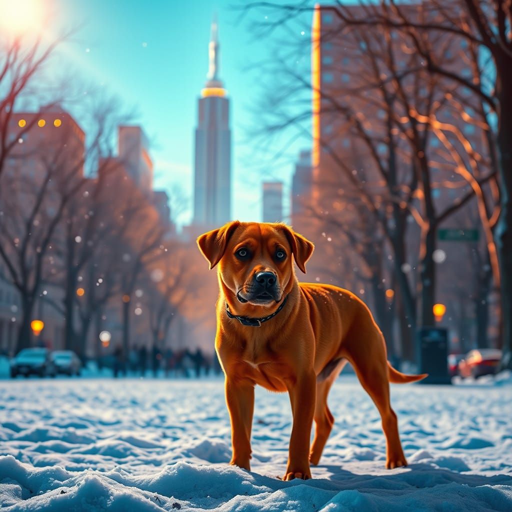 A vibrant image of an orange dog standing in Central Park as snowflakes fall. The artwork is in a synthwave style with glowing neon lights and bright colors, reminiscent of cinematic film stills.
