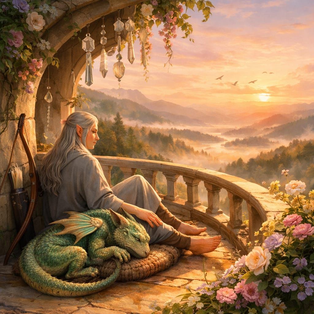 A tranquil epic-fantasy scene at dawn: an elegant elven sanctuary grown from stone and flowering vines, nestled into a green hillside overlooking a mist-filled valley. On a curved balcony, an elven hero with long silver-blond hair and delicate, angular features sits barefoot on a woven cushion, dressed ...