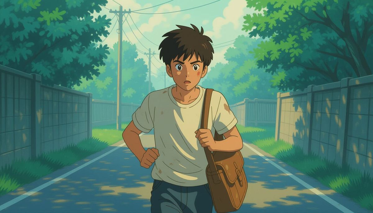 This image features an 18-year-old Indian boy with a determined expression, running with a school bag in early morning fog. Rendered in detailed anime key visual style with natural lighting.