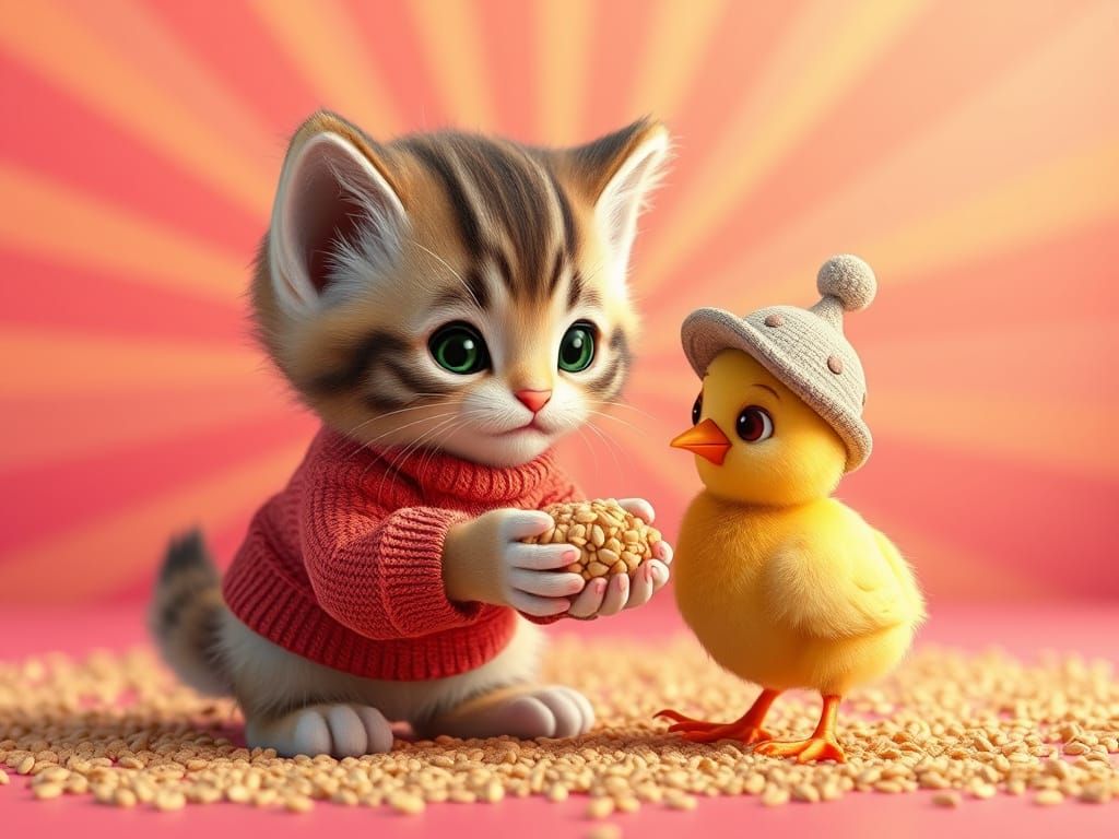 This image shows a fluffy kitten sharing grain with a tiny yellow chicken wearing a hat. This 3D digital artwork has Pixar and Disney inspirations, cinematic lighting, and vibrant colors.