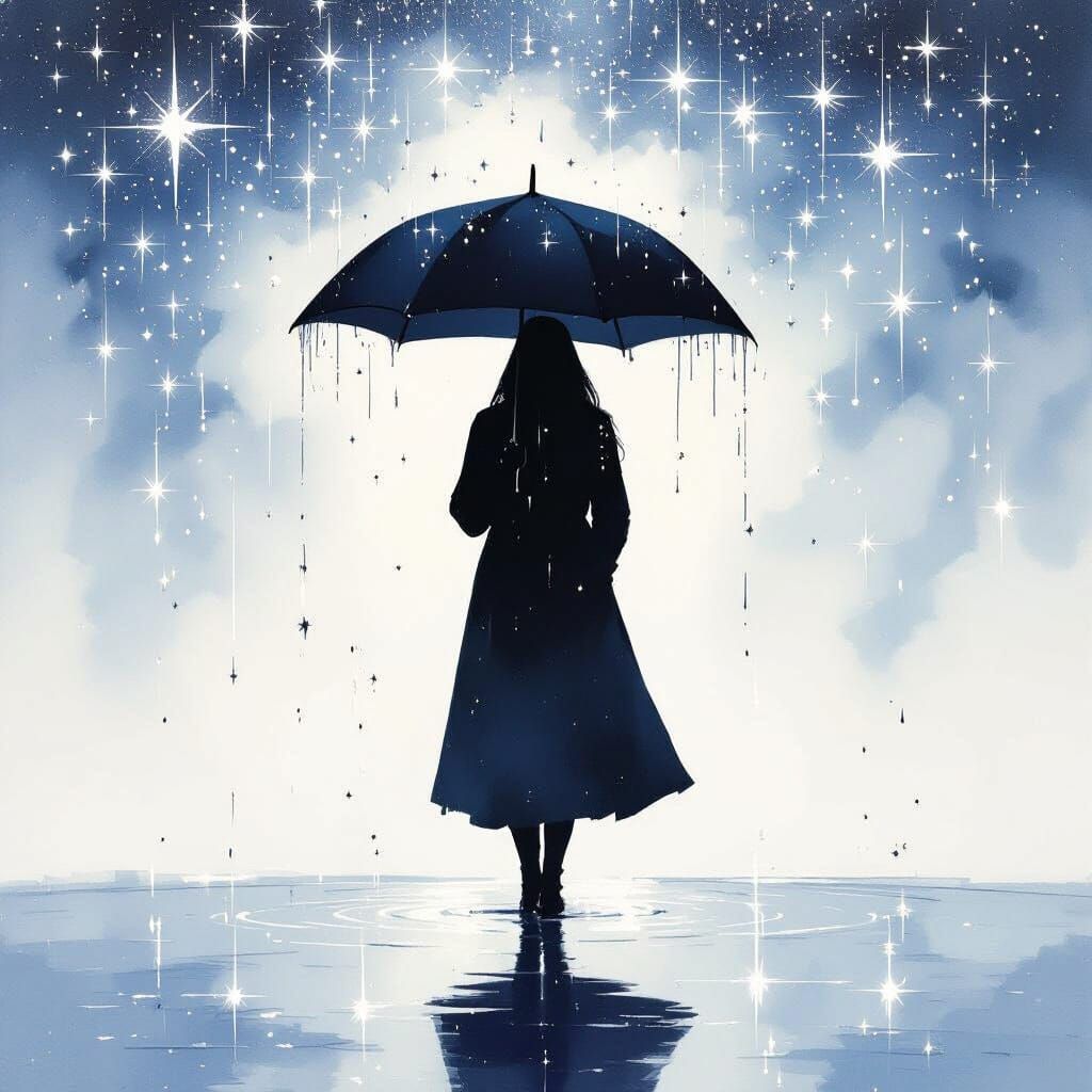 This image shows a silhouette figure in a long coat holding an umbrella under a starry sky. Shimmering silver stars cascade from the sky, bouncing off the umbrella, above a puddle reflecting a vibrant galaxy, in a surreal oil painting style.
