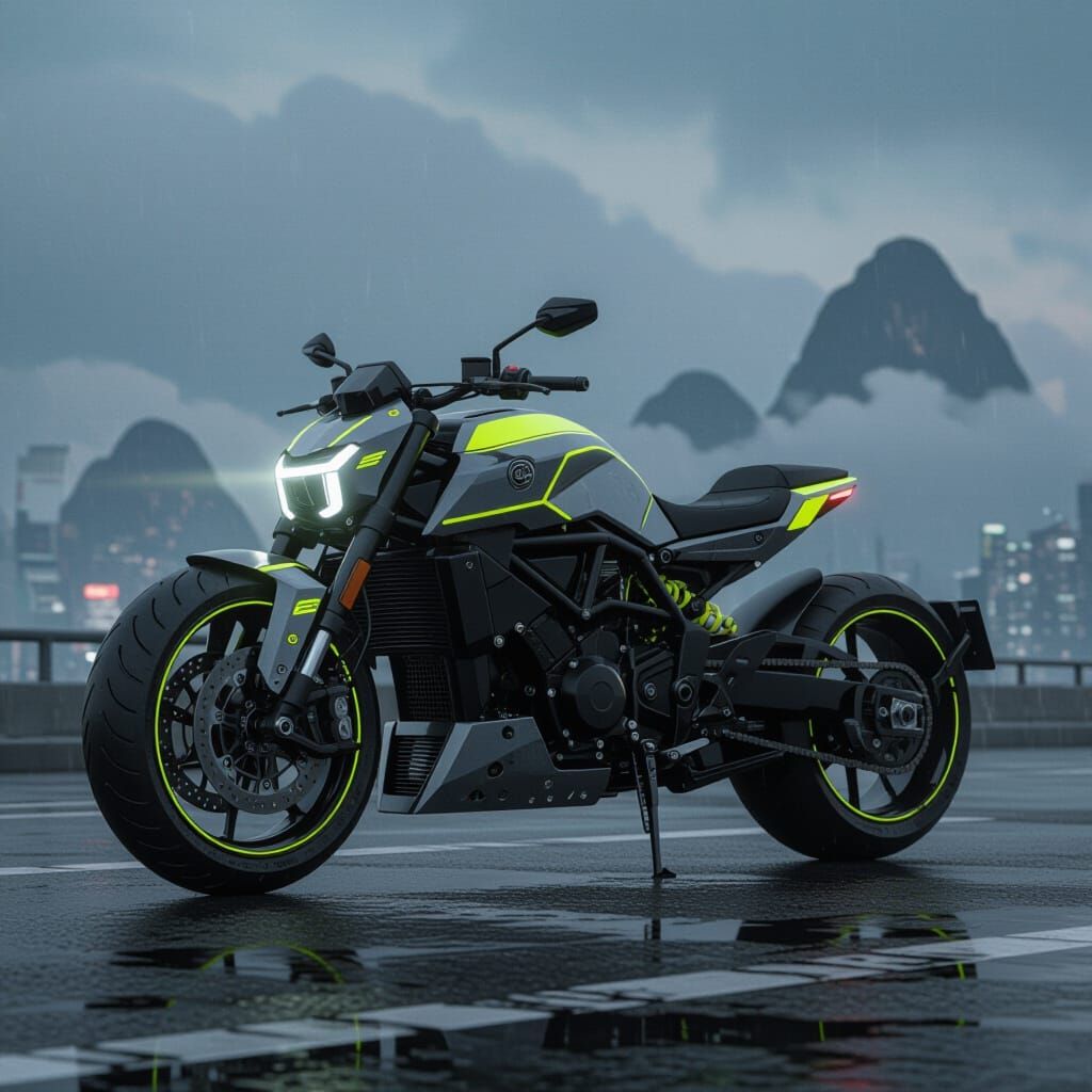 This image showcases a sleek, futuristic motorcycle with a bold aerodynamic design and striking neon yellow accents. Rendered with ultra-detailed textures in a cyberpunk aesthetic, it stands out against a backdrop of fog and floating mountains.