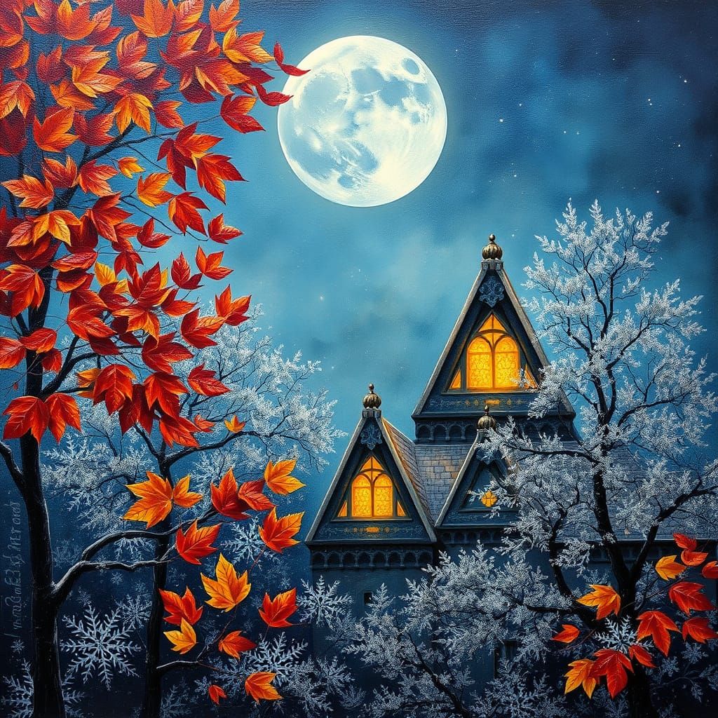 A surreal image of the autumn equinox with leaves, frost, and moon rendered in a patina art style. Organic triangles and thick oil paint evoke Gaudi and Escher.